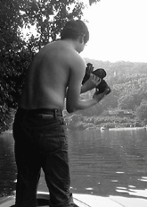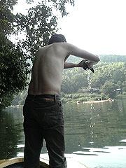 6:45、相模湖に到着。観光桟橋から少し歩いたところにあるボート屋の近くにポイントを定め、さっそく釣り始める。第1釣(2004年7月)で相模湖に来た時に、地元民ユウスケに教わった場所である。考えてみるとこの連載で最初に釣れたのはここ相模湖のバスだ…。一年経って、古巣に帰ってきたような感慨がわいてくる。